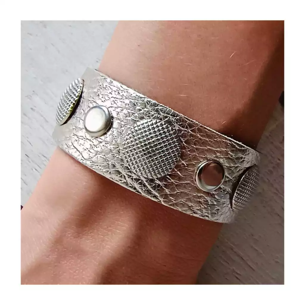 ¡Descubre la Pulsera Coco - Cuero Color Platino con Tachitas Lisas y Texturadas! Este accesorio cautivador es perfecto para quienes buscan un toque de elegancia en su estilo. Fabricada en cuero de alta calidad, su radiante color platino aporta un aire moderno y sofisticado. Las tachitas, tanto lisas como texturizadas, añaden un detalle exclusivo que la distingue. Con un cierre seguro, garantiza un ajuste cómodo para cualquier ocasión. ¡No te pierdas la oportunidad de lucir esta pieza única!